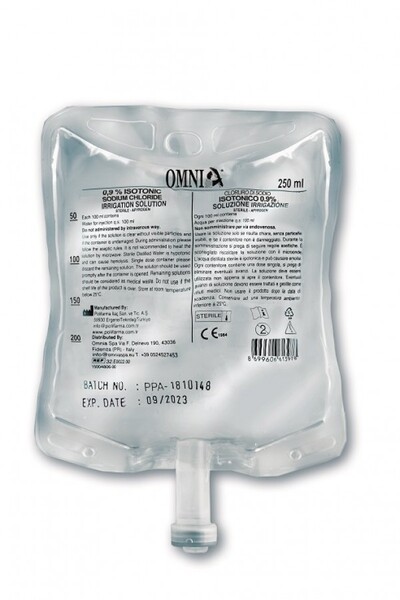 Steril koksaltlösning (natriumklorid 0,9%) för kylning av roterande kirurgiska instrument med anslutning för perforator och Luer Lock i 250 ml påsar - ej underkastat medicinska föreskrifter.