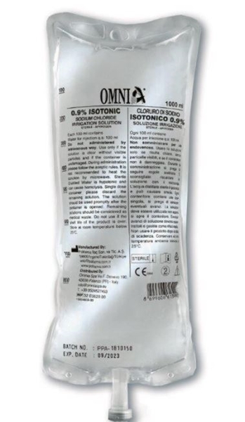 Steril koksaltlösning (natriumklorid 0,9%) för kylning av roterande kirurgiska instrument med anslutning för perforator och Luer Lock i 1000 ml påsar - ej underkastat medicinska föreskrifter.